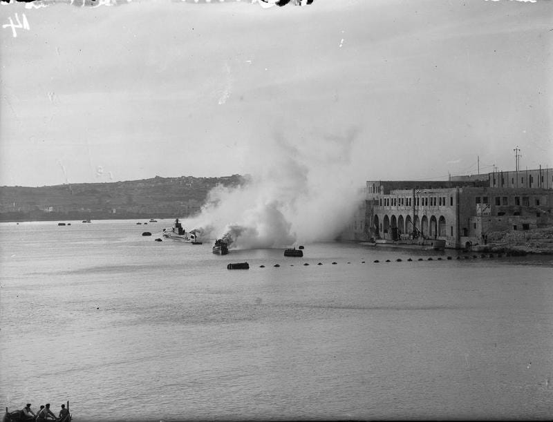 Alerts sounded all through the night of 5 March 1942. The next morning, the 10th Submarine Flotilla moored at Marsamxett Harbour braced for renewed air attacks from the German Luftwaffe. Located just South of Fort Manoel, the strategic harbor is overlooked by the Lazzaretto. The British Admiralty requisitioned the 17th-century hospital and quarantine facility following the outbreak of war in ‘39 — it was quickly turned into a submarine base and the 10th stationed in the harbor. Bombs in the preceding days took out the electricity and telephone lines. And on that fateful morning, three bombs fell alongside the submarine P39. Two missed. Bracing, the submarine’s crew was startled by the deafening sound of one striking metal — the shale oil lighter tied alongside it, X-127, was bursting into flame.